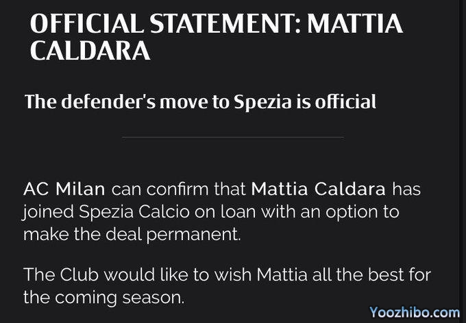 360直播吧07月18日讯 AC米兰官方消息,球队后卫卡尔达拉租借加盟斯佩齐亚,租期一年。