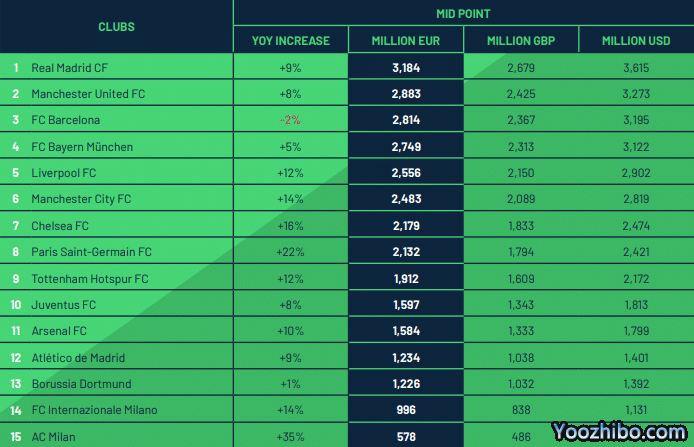 360直播吧05月26日讯 近日,著名会计师事务所毕马威旗下足球基准团队(FootballBenchmark)发布了一年一度的《足球精英报告》。在该报告计算的2022年最新俱乐部企业价值榜单中,西甲豪门皇家马德里连续4年位居榜首,曼联反超巴塞罗那升至第2位,德甲豪门拜仁慕尼黑位列第4,意甲豪门国际米兰则排名居第14。