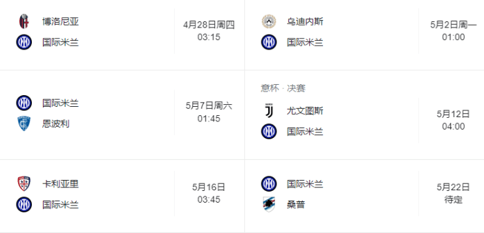 国米还有5轮联赛未踢,赛程分别是客战博洛尼亚(第13)、客战乌迪内斯(第12)、主场战恩波利(第14)、客场战卡利亚里(第17)以及主场战桑普多利亚(第16),中间还有一场和尤文图斯的意大利杯决赛。