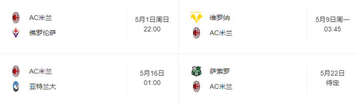 米兰将主场迎战佛罗伦萨(第6)、客场战维罗纳(第9)、主场战亚特兰大(第8)以及客场战萨索洛(第10)。