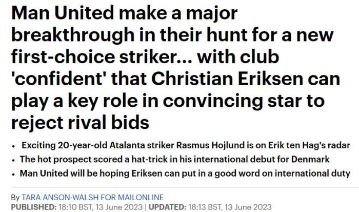 曼联则希望埃里克森在俱乐部安排的任务上也一切顺利,他的丹麦同胞、亚特兰大射手霍伊伦德是夏窗滕哈格的首选引援目标之一。《曼彻斯特晚报》称,红魔有信心埃里克森能说服「新埃尔林·哈兰德」,后者从小就支持曼联,拥有「儿魔梦」。