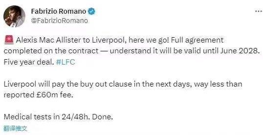 罗马诺透露,麦卡利斯特将与利物浦签约5年至2028年6月。小麦将会在24至48小时内,接受利物浦方面安排的体检,而红军最快将在本周内就官宣他的加盟。