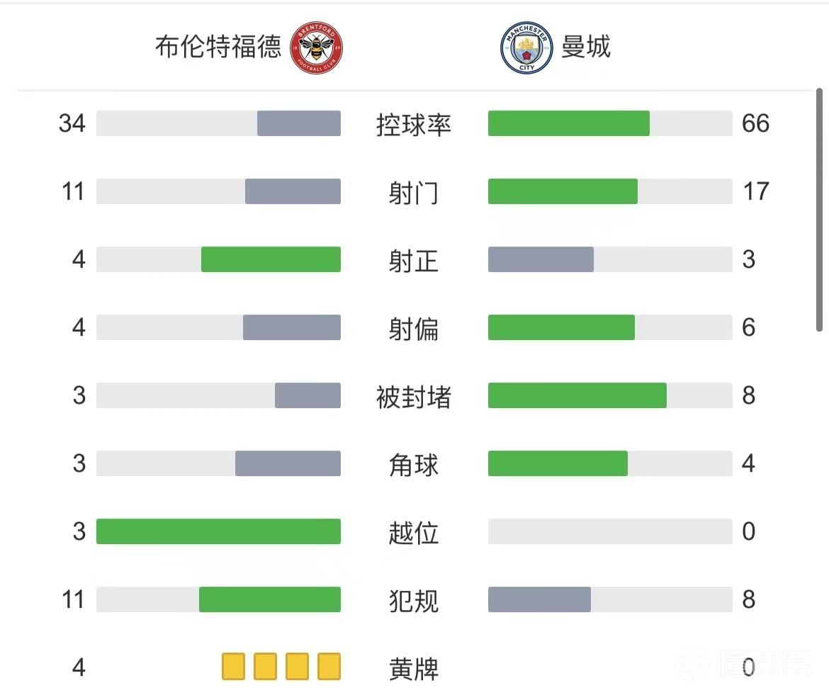 最终曼城0-1布伦特福德。