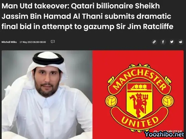 360直播吧04月17日讯 就在围绕曼联收购的戏剧性事件似乎即将结束的时候,据《每日邮报》报道,谢赫-贾西姆-本-哈马德-阿勒萨尼又回到了谈判桌前,提出了收购俱乐部100%股权的最终报价,以绝望的方式将格雷泽的注意力从吉姆-拉特克利夫爵士身上转移开。