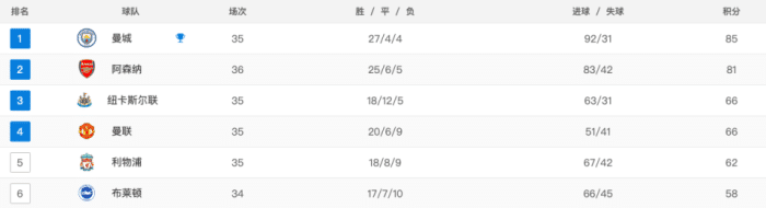 英超方面,卫冕冠军曼城35轮后积85分领跑,领先多赛1场的阿森纳4分。这也意味着本周末,曼城只要主场击败切尔西便能提前2轮夺得联赛冠军。而如果先赛的阿森纳输给诺丁汉森林,曼城甚至不用踢,便能“躺着”实现英超3连冠的伟业。
