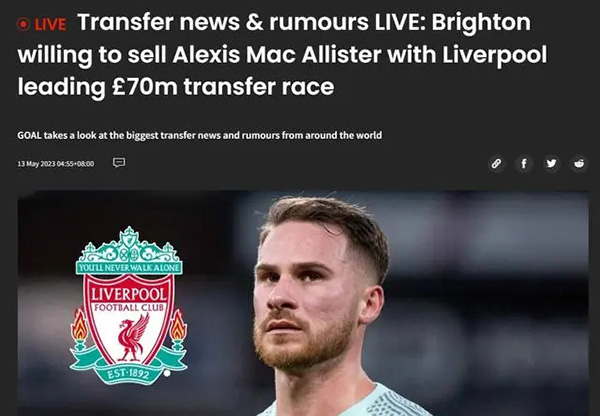 根据该记者的报道,布莱顿只会听取7000万欧元的报价,目前利物浦是最有可能签下他的俱乐部。