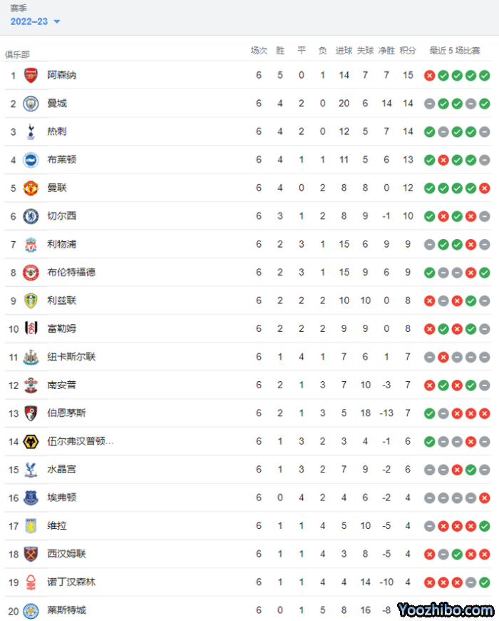 阿森纳输球后6轮15分仍然领跑,曼城、热刺少1分排名二三,海鸥布莱顿6轮13分排名第四。