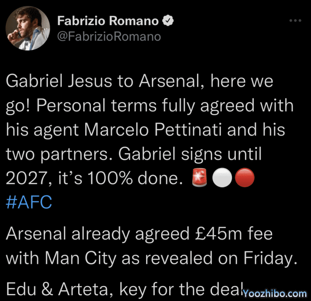 360直播吧06月27日讯 日凌晨,知名转会专家罗马诺在个人社交账号上确认,巴西射手热苏斯的经纪人已经与阿森纳俱乐部达成协议。双方将签约5年至2027年。而热苏斯也将成为继马尔基尼奥斯和法比奥-维埃拉之后,阿森纳夏窗的第三位新援。