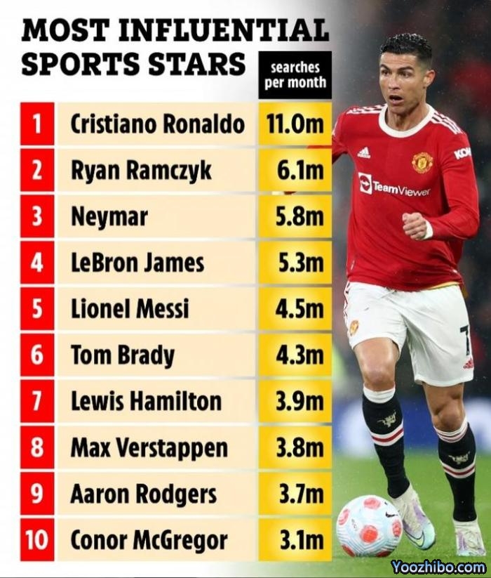 360直播吧06月25日讯 据《太阳报》消息,C罗成为全球搜索量最高的体育明星,平均每月被搜索1100万次。