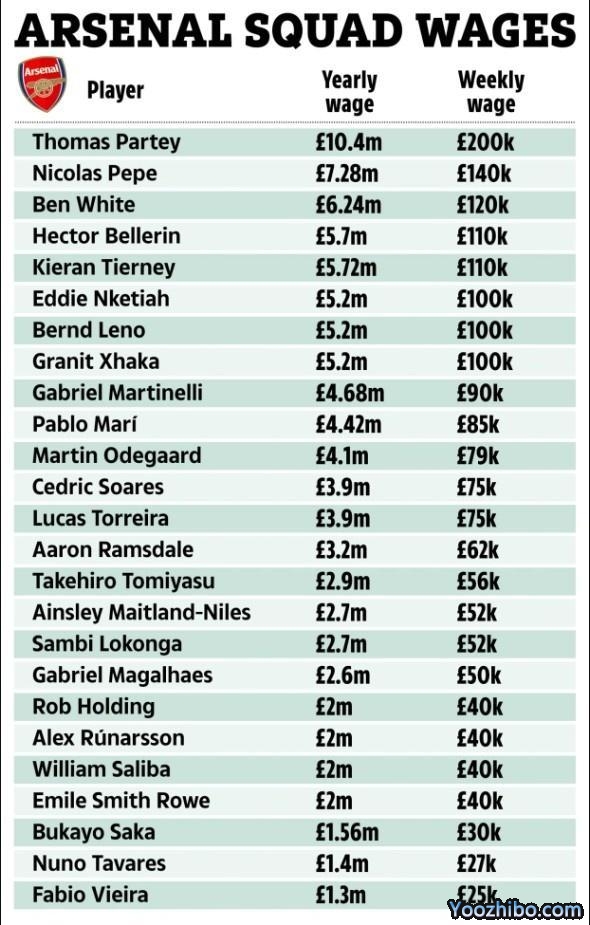 数据表明,刚刚续约的恩凯提亚周薪已经上涨到了10万英镑,而托马斯则是队内薪水最高的球员,达到20万英镑,佩佩14万英镑排名第二。