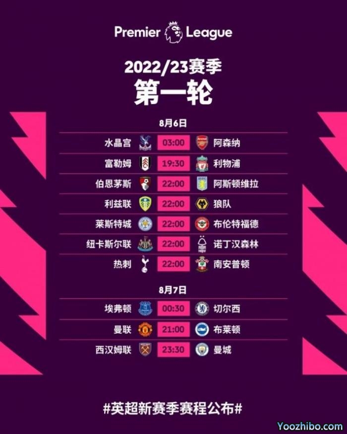 8月6日一共有7场比赛,北京时间凌晨3点阿森纳做客水晶宫,19:30利物浦做客富勒姆,其他5场比赛都在22点进行。8月7日进行第一轮剩余的3场比赛。