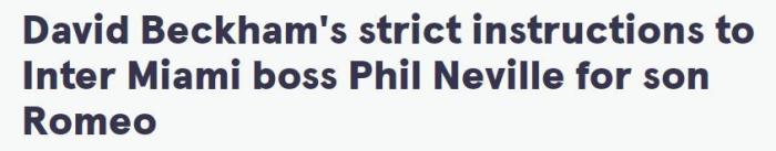 360直播吧9月22日讯 据英国媒体《镜报》报道,迈阿密国际主帅菲尔-内维尔在接受采访时表示,贝克汉姆告诉他不要特别照顾自己的儿子罗密欧,反而对他要比对其他人更加严厉。