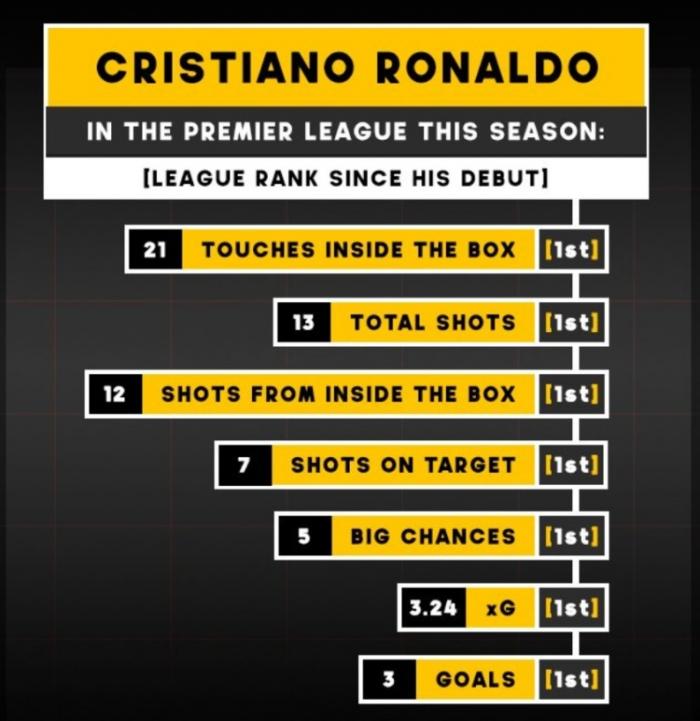 360直播吧9月21日讯 今年夏天,欧洲转会市场上最令人疯狂的两笔转会无疑就是梅西转会巴黎和C罗转会曼联了。而世界上最好的两名球员转会之后,他们在新东家的表现如何呢?今天来看看C罗在英超的表现如何,而近日就有英格兰媒体盘点了C罗回归曼联之后的比赛数据,他有7项数据位居英超第一,不得不说,C罗绝对是英超独一档的存在,他依然是英超最顶级的球星。