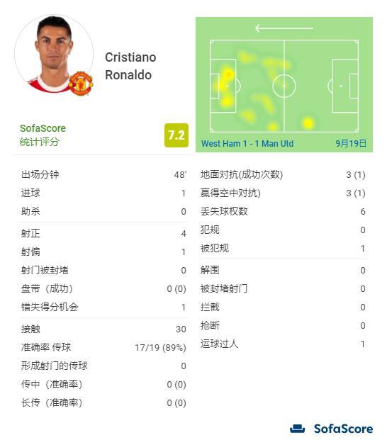 触球30次,19次传球成功17次,6次对抗成功2次,6次丢失球权。