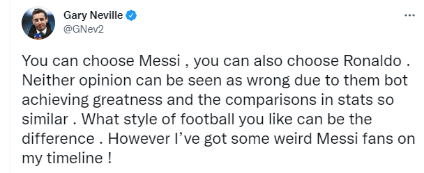 360直播吧讯 9月15日消息,加里-内维尔表示,选择梅西或C罗作为历史最佳都没错,但一些梅西球迷很古怪。
