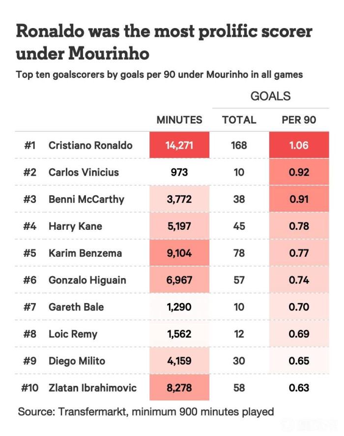如图,C罗在穆帅手下出场14271分钟,打进了168球,平均每90分钟打进1.06球,是穆帅手下表现最好的前锋。而第二的就是维尼休斯,他平均每场打进0.92球;第三是麦卡锡,他平均每场0.91球;第四是凯恩,在穆帅手下他场均打进0.78球,第五是本泽马,他场均打进0.77球,第六是伊瓜因,他场均打进0.74球,第七是贝尔,他场均0.7球,第八是雷米,他场均0.69球,第九是米利托,他场均0.65球,第十是伊布,他场均0.63球。