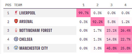 目前,红军在多赛1场情况下领先阿森纳多达15分。根据权威数据网站最新的概率,利物浦夺得本赛季英超概率已经增至99.7%,而阿森纳逆袭夺冠的概率仅剩0.3%,包括卫冕冠军曼城在内的其他18支球队夺冠概率已经为0。毫不夸张的说,尽管联赛还剩10轮,但利物浦一只手已经抓住了英超冠军奖杯了。